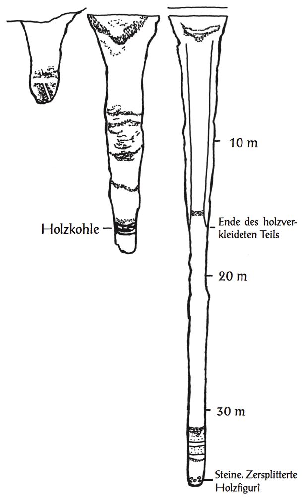 Die Schanze von Holzhausen in Bayern wies drei solcher Schächte auf. Der Nordschacht hatte eine Tiefe von 6 m und enthielt einen Holzpfahl (2 m lang), der unter Verwendung von Lehm und Steinen sorgfältig befestigt worden war. Der südwestliche Schacht mit seinen 18 m Tiefe enthielt mehrere Schichten verbrannter Opfergaben. Der tiefste der drei ist der Nordwestschacht mit einer Tiefe von 35 m. Der Pfahl, Pfeiler oder Baumstamm im kürzesten Schacht ist interessant. Warum sollte jemand einen einzelnen Pfeiler so tief in der Erde errichten und, wie sorgfältige Analysen ergeben haben, ihn solchermaßen behandeln, dass Spuren von Fleisch und Blut an ihm zurückbleiben? Auf die Verehrung heiliger Bäume bei den keltisch-germanischen Stämmen (und vielen anderen indo-europäischen Kulturen) zu verweisen, reicht nicht. Es erklärt nicht, weshalb der Baum im Untergrund verehrt worden wäre. Was würdest Du vorschlagen? Sieh Dir einmal die Schächte in der Vendée in Frankreich an. Der mit 12 m tiefere von beiden war sorgfältig in vier Abschnitte unterteilt worden. Am Grunde des Schachts befand sich eine kleine Statue, und er war mit Erde aufgefüllt, die von Hirschgeweihen, Zweigen und Muscheln durchsetzt war. Dieser Abschnitt war mit einer Lage Steine abgeschlossen worden. Dann folgte der nächste Abschnitt – hauptsächlich Erde, durchsetzt mit Tierknochen und Töpferwaren. Eine weitere Lage Steine schloss diesen Teil ab. Darüber entdeckten die Archäologen eine Schicht Holzkohle, von noch mehr Steinen bedeckt. Oberhalb dieses Teils war der Schacht gefüllt mit Steinen und Knochen, manche von menschlicher Herkunft. Der obere Teil des Schachtes war gemauert, und der Steinmetz hatte ihn sorgfältig mit einem Deckel verschlossen. Der andere Schacht in der Vendée mit seinen 8 m Tiefe enthielt ebenfalls einen Baum, der grob gestutzt worden war, so dass einige seiner Äste herausstanden. Hier könnte auch vermutet werden, dass der Baum als Leiter diente. In der Nähe lag ein ausgehöhlter Baumstumpf. Rundherum fanden sich Erde, Töpferwaren, Krüge, Menschen- und Tierknochen. Der obere Teil war durch Mauerwerk verschlossen.