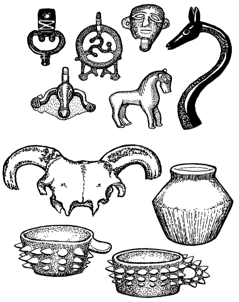 Unten: La Tène -Grabgüter aus der Wetterau, Hessen, Deutschland. Widderschädel aus Bad Nauheim, Einäscherungsurne aus Rockenberg, stachelbesetzte Becher aus Heldenbergen und Bad Nauheim. Kultobjekte, Punk-Kunst oder ein Scherzartikel?