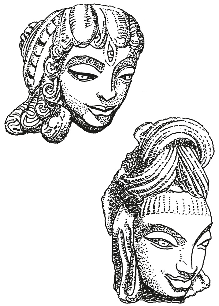Oben: Kopf von Pārvatī oder Umā, Terrakotta in Gupta-Stil, 5. Jahrhundert.
