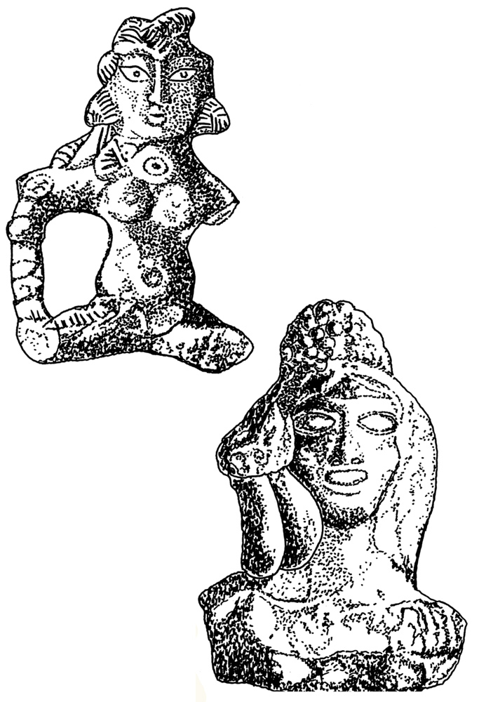 Oben: Unbekannte Göttin, Terrakotta, 2. Jahrhundert v.u.Z., Bangarh, Bengalen, 15 cm hoch.