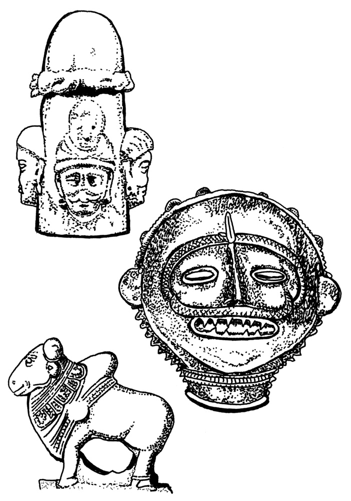 Oben: Śiva-Liṅga mit vier Köpfen, Stein, 2. Jahrhundert v.u.Z.