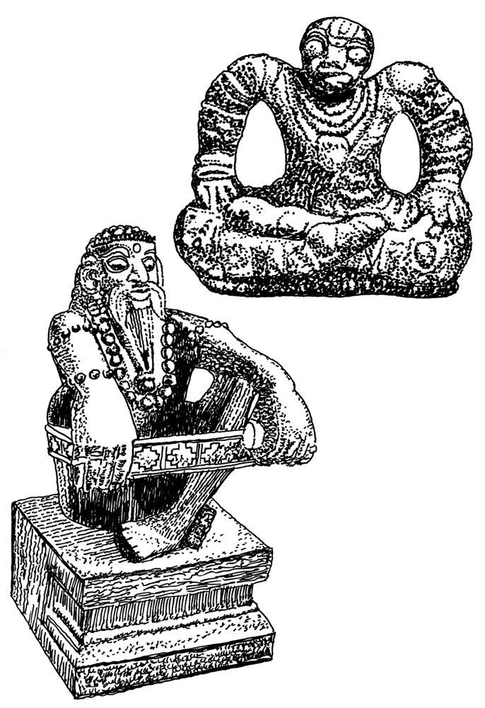 Unten: Steinstatuette, Yogī, der ein Band zur Stabilisierung seiner Haltung verwendet. Tamil Nadu, 16. Jahrhundert.