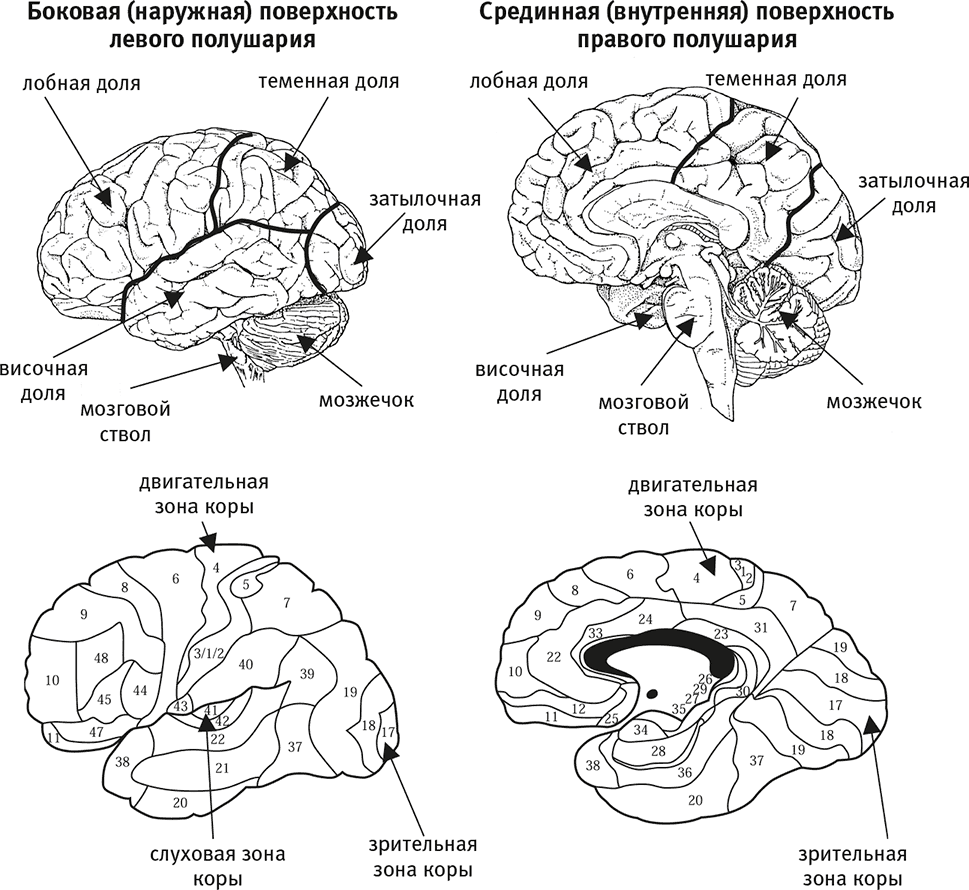 Вверху показаны основные части головного мозга. Внизу показаны области (“поля”) коры головного мозга по Бродману (мозжечок и мозговой ствол удалены). Поля Бродмана выделены на основании внешнего вида участков коры под микроскопом. Номера, присвоенные этим полям, условны.