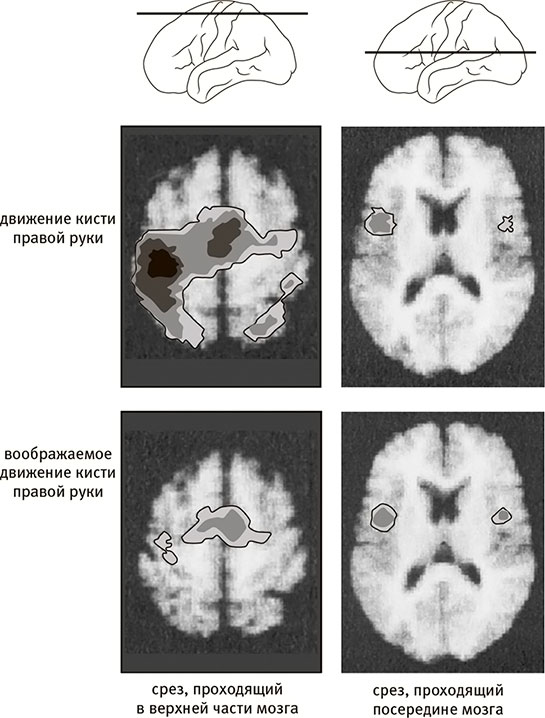 На схемах вверху показано, как проходят срезы мозга (в верхней части и посередине), на которых видна мозговая активность. На верхних срезах показана активность, наблюдаемая, когда испытуемый двигает правой рукой, а на нижних – активность, наблюдаемая, когда испытуемый только представляет себе, что двигает правой рукой.