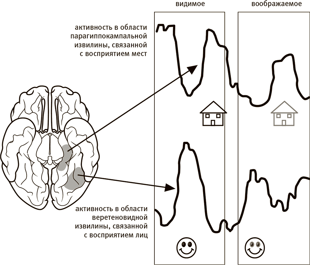 Возможно, мне стоило заняться не этим, а изучением зрения. Нэнси Кэнуишер и ее группа в Массачусетском технологическом институте показали, что когда мы смотрим на лицо (чье угодно), у нас в мозгу всегда активируется определенный участок, а когда мы смотрим на дом (какой угодно), то активируется другой участок мозга, расположенный поблизости[19]. Если попросить испытуемого представить себе уведенное несколько секунд назад лицо или здание, в его мозгу активируются соответствующие участки. Когда я лежу внутри сканера в лаборатории доктора Кэнуишер, она может сказать, о чем я думаю (если я думаю только о лицах или только о домах).