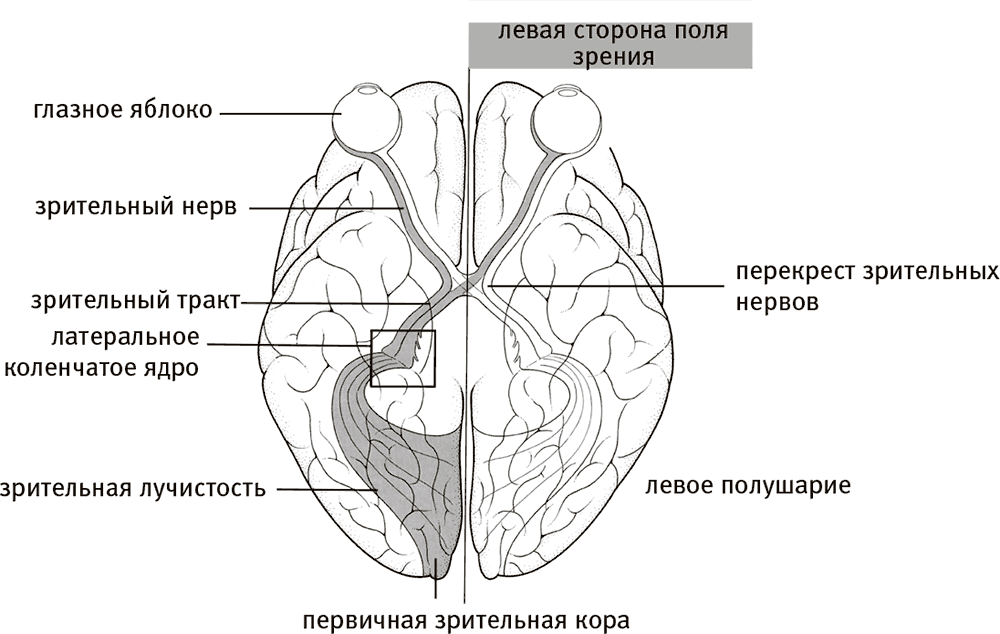 Сигнал о свете из левой стороны поля зрения поступает в правое полушарие. Мозг показан снизу.