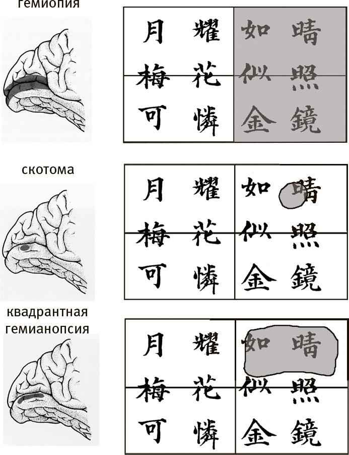 Повреждения зрительной коры вызывают слепоту на определенных участках поля зрения. Потеря всей зрительной коры правого полушария вызывает слепоту на всей левой стороне поля зрения (гемиопия). Потеря небольшого участка в нижней половине зрительной коры правого полушария приводит к появлению слепого пятна в левой верхней половине поля зрения (скотома). Потеря всей нижней половины зрительной коры правого полушария вызывает слепоту на всей верхней половине левой стороны поля зрения (квадрантная гемианопсия).