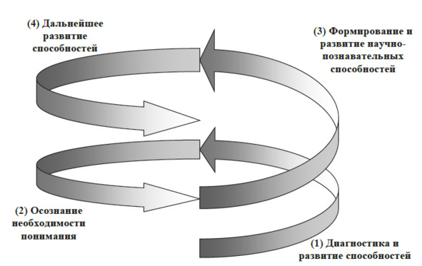 Таким образом, при обучении познавательные и, в первую очередь, мыслительные способности обучающихся развиваются в процессе познавательной деятельности, основанной на познавательном интересе. А это означает, что речь должна идти о развивающем обучении, содержание, методы и формы организации которого прямо ориентированы на закономерности развития личности. В соответствии с этими закономерностями [23] для возникновения и реализации познавательного интереса важно понимание внутренней структуры продуктивного познавательного процесса и принципиальной возможности трансляции этой структуры.