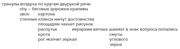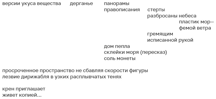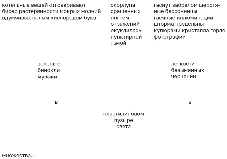 плантация полыхает схема гнездаполдень в разрезе разодранные смерчигамма разрез искрит (шов глазу) о каменные суффиксыкубический свет земляные узоры повторяй изгибы огня сей ночь вскользь трав вычитывая кору досуха вплетения солнца в полюснаблюдать из спектра встречные пески приходили цвет армироватьбуква шипит в диких библиотеках правее фотография звука чертеж гаснет так сложнонеравенства ландшафт вкладывает в горизонт«Острота на заглушенных пальцах…»