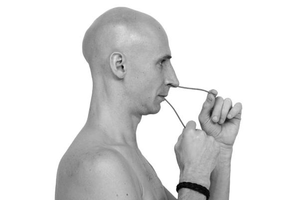 Таким образом, один кончик шнура оказывается торчащим из носа, а другой – изо рта. На первый раз достаточно вытащить катетер через рот; в дальнейшем нужно подвигать его туда-сюда, постепенно (с каждой последующей процедурой) доводя количество массирующих движений до 5-10 на каждый носовой ход (фото 2).