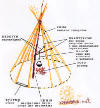 Чум тунгусов-эвенков назывался дю. Тунгусы были пешими кочевниками, Сибирь они освоили третьими – после палеоазиатов и юкагиров. Возможно, именно они и научили все местные племена строить чумы. А может – наоборот, научились у них. Хотя конструкция эта настолько проста, что скорее всего просто её придумали одновременно разные люди в разных местах. Вот так был устроен дю внутри (см. рис. 1 и рис. 2).