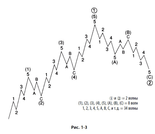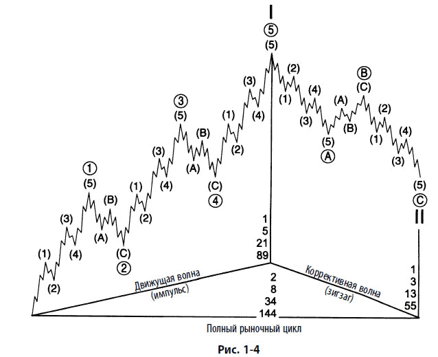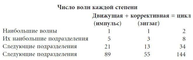 Связь формы, степени и относительного направления показана на рис. 1–4. Эта иллюстрация отражает общий принцип: в любом рыночном цикле волны будут подразделяться так, как показано в таблице.