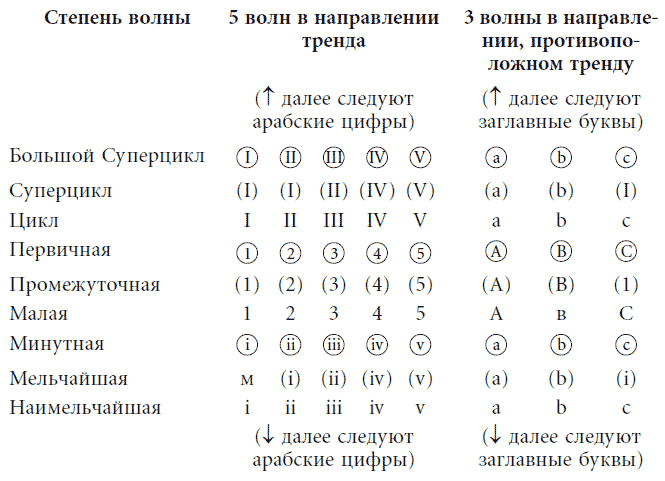 Для того чтобы помечать волны на графике, необходима определенная схема, позволяющая различать степени волн в рыночной прогрессии. Как показано в приведенной ниже таблице, мы стандартизировали порядок следования волновых обозначений, среди которых есть цифры и буквы и есть несколько моментов, до сих пор отсутствовавших. Прогрессия бесконечна в обоих направлениях. Она основывается на легкозапоминающейся повторяемости. Движущие волны обозначаются чередующимися наборами римских и арабских цифр. Волны больших степеней помечаются тремя наборами римских цифр, за которыми по мере уменьшения масштаба волн следуют три набора арабских цифр, которые, в свою очередь, сменяются очередным набором римских цифр, и т. д. В обозначениях коррективных волн сходным образом чередуются три заглавные и три строчные буквы. Строчные римские цифры используются для степеней ниже малой, а заглавные – для более высоких степеней, так что беглый взгляд на график обнаруживает определенную перспективу на его временной шкале. (Некоторые рисунки, приведенные в книге, отклоняются от этого стандарта, поскольку были созданы до его принятия.)