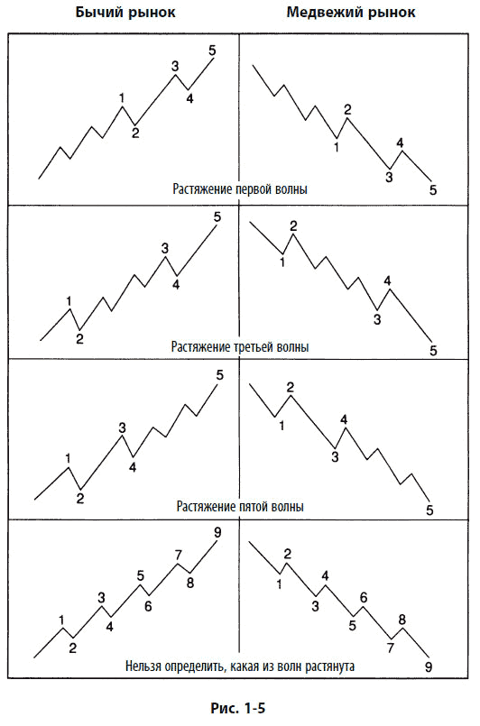 Большинство импульсов содержит то, что Эллиотт называл растяжением. Растяжение – это удлиненный импульс с ярко выраженными внутренними волнами. Подавляющее большинство импульсов содержит растяжение в одной и только в одной из трех действующих подволн. Иногда части растянутой волны имеют почти ту же амплитуду и длительность, что и остальные четыре волны более крупного масштаба, что в целом скорее дает девять волн схожего размера, чем нормальную пятиволновую последовательность. В девятиволновой последовательности иногда трудно сказать, какая из волн растянута. Однако это обычно не так и важно, поскольку в рамках системы Эллиотта наличие девяти– и пятиволновой последовательности имеет одно и то же техническое значение. Диаграммы, изображенные на рис. 1–5, проясняют этот момент.