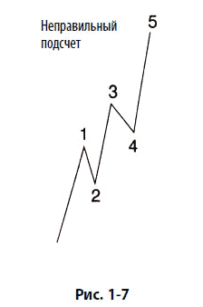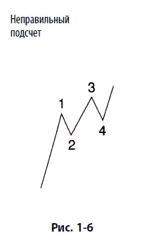 На фондовом рынке наиболее часто растянутой волной оказывается волна 3. Этот факт особенно важен для интерпретации волны в режиме реального времени, когда он рассматривается в соединении с двумя правилами, касающимися импульсных волн: волна 3 никогда не бывает самой короткой из действующих волн, а волна 4 не может перекрывать волну 1. Для ясности представим две ситуации, связанные с неправильной интерпретацией третьей волны (рис. 1–6 и 1–7).