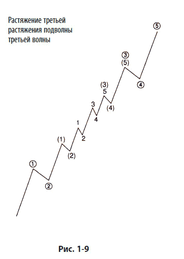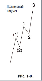 На рис. 1–6 волна 4 перекрывает вершину волны 1. На рис. 1–7 волна 3 короче, чем волна 1 и волна 5. В соответствии с правилами, ни один из этих способов подсчета волн не приемлем. Очевидно, что волну, обозначенную на рис. 1–6 и 1–7 цифрой 3, следует пометить иначе. В большинстве случаев данная волна является первой подволной растянутой волны 3, как показано на рис. 1–8. Умение распознавать растяжение третьей волны на ранней стадии очень важно для волнового аналитика. В этом вы убедитесь при обсуждении индивидуальных примет волн (см. главу 2). Рис. 1–8, возможно, наиболее полезный в данной книге указанием на то, как следует подсчитывать импульсные волны в режиме реального времени.