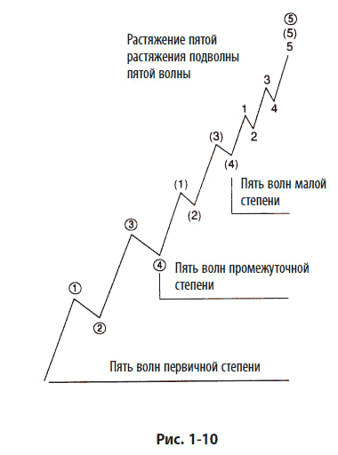 На рис. 1-10 продемонстрировано растяжение пятой подволны внутри растянутой пятой волны. Растяжение пятой подволны встречается, как правило, в случае сильных растущих трендов на товарных рынках (см. главу 6) и почти не наблюдается на фондовом рынке.