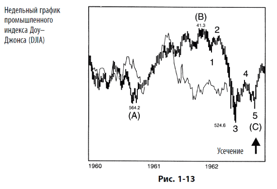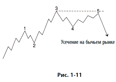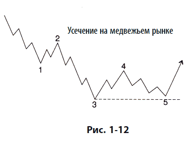 Эллиотт использовал слово «неудача» (failure) при описании ситуации, когда пятая волна не уходит дальше конца третьей волны. Мы предпочитаем более спокойный термин «усечение» или «усеченная пятая» волна. Обычно усечение может считаться подтвержденным, если замечено, что предполагаемая пятая волна содержит все пять необходимых подволн, как показано на рис. 1-11 и 1-12. Усечение часто возникает вслед за особенно сильной третьей волной.