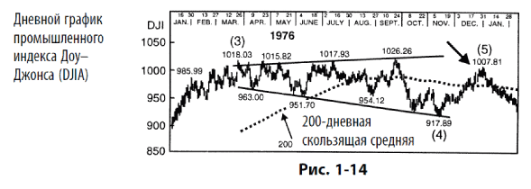 Американский фондовый рынок дает два примера усеченных пятых волн высоких степеней за всю историю c 1932 г. Первое такое усечение возникло на медвежьем рынке в октябре 1962 г. во время Карибского кризиса (см. рис. 1-13). Оно последовало за крахом, который проявился как волна 3. Второе возникло в конце 1976 г. (см. рис. 1-14). Оно последовало за мощной растущей волной (3), которая развивалась с октября 1975 по март 1976 г.