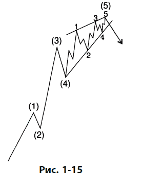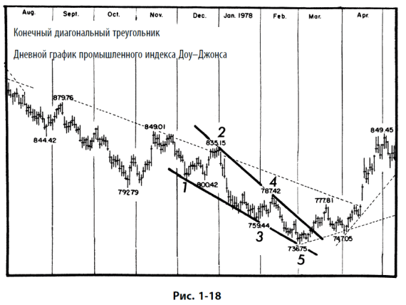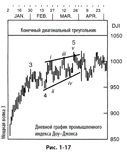 Конечные диагональные треугольники принимают форму клина, ограниченного двумя сходящимися линиями. Каждая подволна, включая волны 1, 3 и 5, подразделяется на «тройку», что в других случаях является признаком коррективной волны, приводя к общему подсчету 3–3 – 3–3 – 3. Конечные диагональные треугольники изображены на рис. 1-15 и 1-16, где они показаны в своих типичных позициях внутри более крупной импульсной волны.