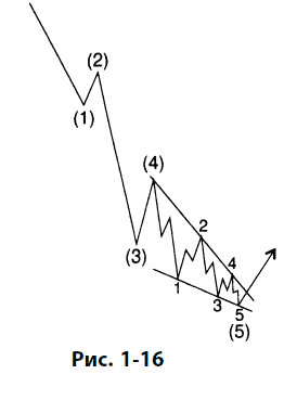 Хотя на рис. 1-15 и 1-16 проиллюстрированы иные случаи, пятая волна диагонального треугольника часто оканчивается «выбросом» цены, т. е. кратким проколом линии тренда, соединяющей конечные точки первой и третьей волн. Примеры из реальной жизни, приведенные на рис. 1-17 и 1-19, показывают ценовые «выбросы». В то время как по мере формирования диагонального треугольника малой степени оборот торгов чаще всего снижается, в момент «выброса», как правило, наблюдается резкий рост оборота. В редких случаях пятая подволна треугольника не доходит до своей трендовои линии сопротивления.