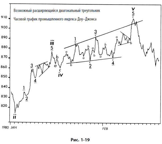 Рис. 1-17 и 1-18 показывают два из этих периодов, иллюстрируя в одном случае восходящее, а в другом – нисходящее направление модели в реальной жизни. На рис. 1-19 показан наш возможный расширяющийся диагональный треугольник. Обратите внимание на то, что в каждом случае за конечным диагональным треугольником следует важное изменение направления.