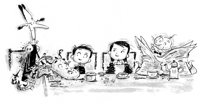 Тётя Эглантина занималась с маленьким драконом: она пыталась научить его сидеть за столом. Дело шло туго.