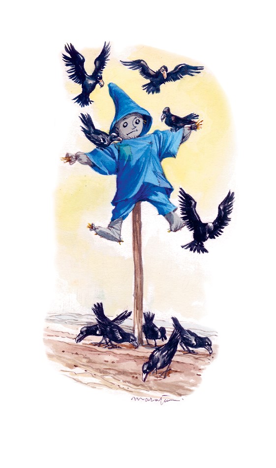 Мне не понравилось, что меня бросили на произвол судьбы, и я попытался пойти вслед за ними, но мои ноги никак не могли достать до земли, и я был вынужден оставаться на этом шесте. Мне было скучно одному – я даже не мог предаться воспоминаниям, потому что мне не о чем было вспоминать. До этого над полем летали птицы, но, увидев меня, они испугались, что пришёл человек, и куда-то скрылись. Это мне придало немножко уверенности, я почувствовал себя важной персоной. Но прошло совсем немного времени, и ко мне подлетела старая ворона. Внимательно меня осмотрев, она села мне на плечо и сказала: