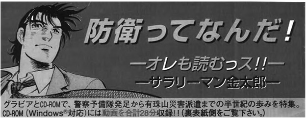 Рис. 5. Обложка отчета 2001 г. с изображением Саларимена Кинтаро на ярко-розовом фоне в расчете на привлечение внимания молодежной аудитории. Этот герой бестселлера-манги, адаптированного для телевизионного и кинофильма, говорит: «Что значит оборона? Мне необходимо это прочитать!!!» Образ намекает на превращение Кинтаро из хулигана-мотоциклиста в героя-саларимена, что указывает на потенциал радикального преображения человека в рядах Сил самообороны