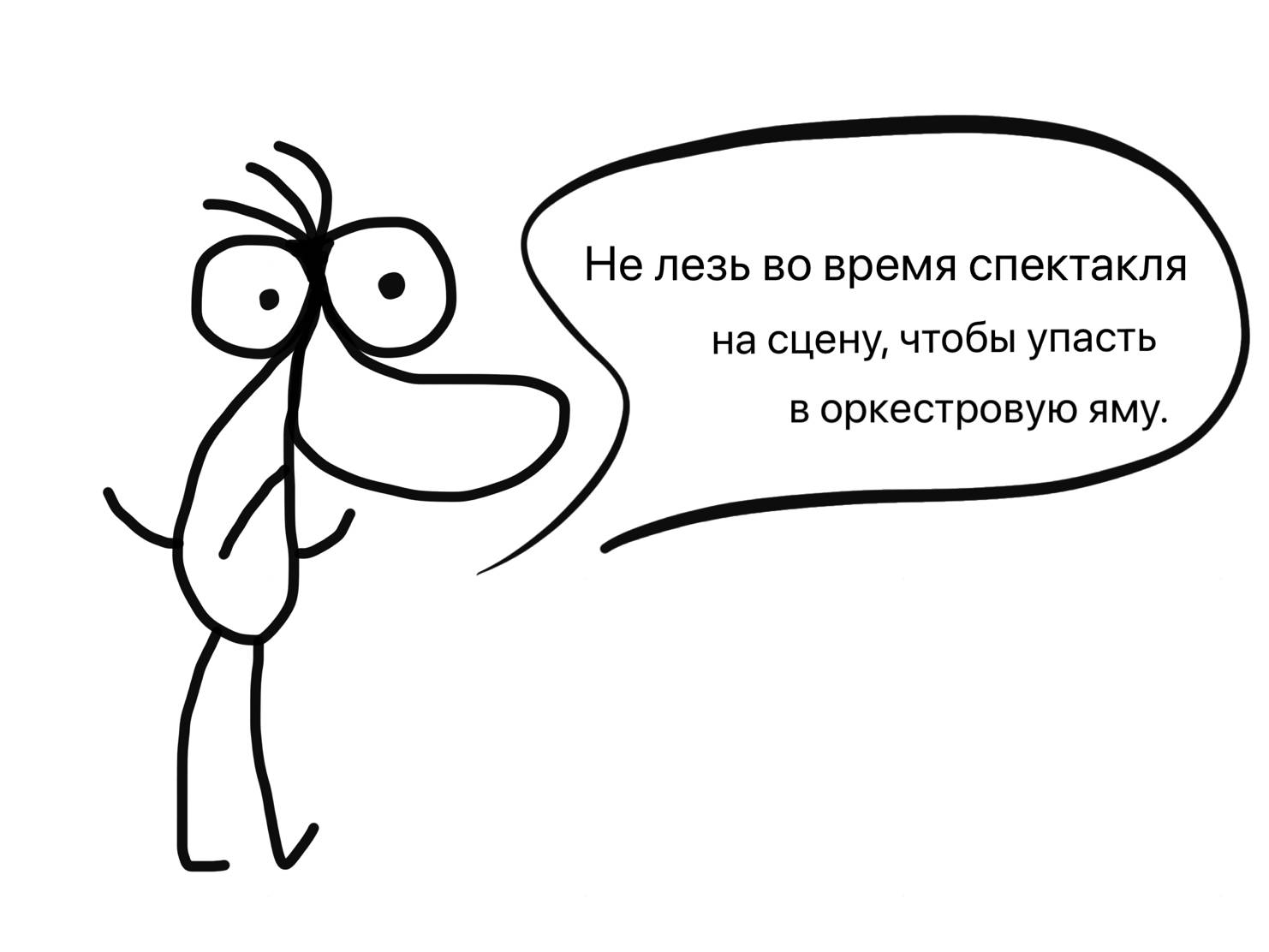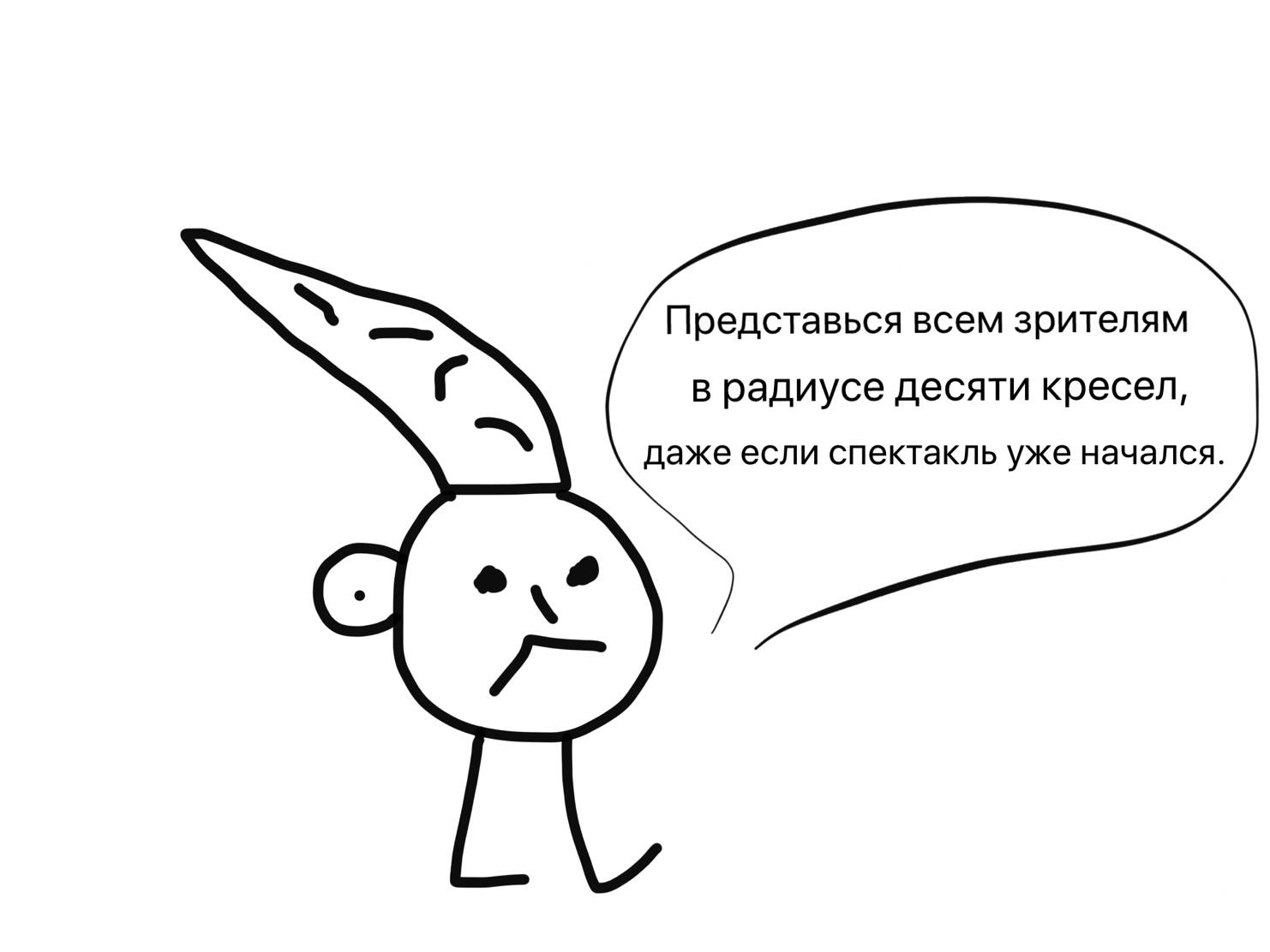 Проходит еще пять минут. Раздраженные зрители снова начинают приподниматься, поглядывая на сцену и все еще надеясь, что действие наконец-то начнется.