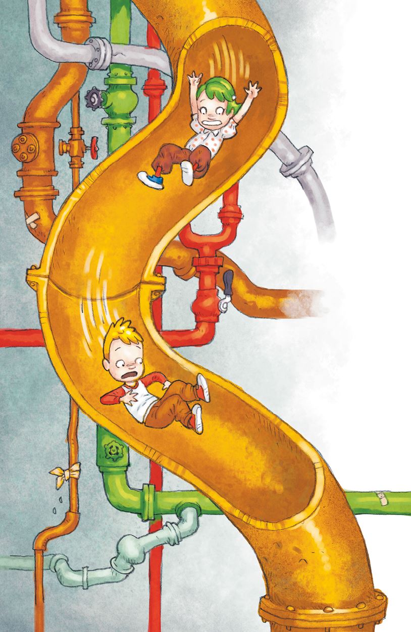 Маркус и Марианна, крича, падали вниз в образовавшуюся под ними дыру. Они чувствовали, что находятся на какой-то дикой горке, идущей в основном вниз, но иногда поднимавшейся чуть вверх – и всё это на большой скорости. В конце горки дети приземлились на ожидавший их диван.