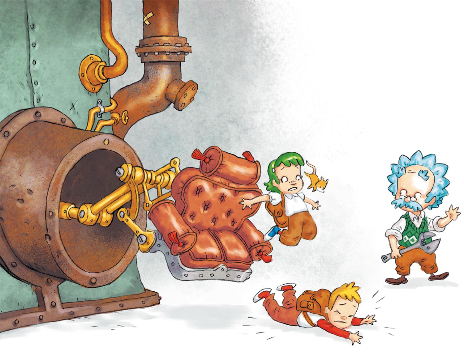 «Дзынь-дзынь», и дети исчезли под землёй. Они плюхнулись на диван, точно как в прошлый раз, и понеслись из комнаты в комнату, пока диван не остановился так резко, что они выпали на пол, оказавшись прямо перед Лунником, который возвышался над ними во всей красе. Рядом стоял дядя Альберт и что-то в нём подкручивал.