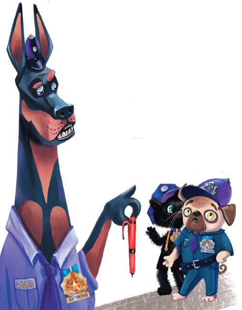 Перед Мурмяу стоял пёс. Маленький, не больше среднего кота. Шерсть короткая, бежевая. Чёрные висящие уши. Нос – тоже чёрный. Хвост крючком. И глаза – огромные, навыкате, в половину морды. На груди у пса блестел значок «Полиция г. Лайкин. Детектив», приколотый к ярко-синей ленте.