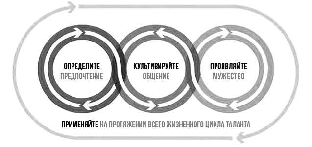 Когда речь идет о борьбе за талант, об удержании ярких талантов, обеспечении сотрудничества и инноваций, то организация может облегчить себе достижение этих целей с помощью жизненного цикла таланта. Мы часто считаем жизненный цикл таланта вотчиной юридической и кадровой политики; но для достижения мощного жизненного цикла таланта все лидеры должны выйти за рамки правил, стратегий и процедур, прописанных в правилах внутреннего распорядка компании. Этот последний компонент концепции проработки предпочтений, ее внешняя оболочка, помогает стратегиям сойти со страниц в жизнь и повлиять на реальные результаты деятельности организации.
