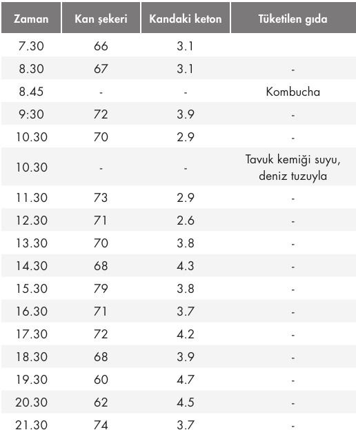 Bu oruçta her şey su gibi akıyordu, kan şekerimde harika iyileşmeler görüyordum, yeniden 60’lara, 70’lere inmişti, keton düzeylerim yine 2,5 milimoların üstüne çıkmıştı ve kendimi harika hissediyordum. 11. gün kan şekerimi ve keton düzeyimi saat başı ölçerek neler olup bittiğine bakmaya karar verdim. Sonuçlar 34. sayfadaki tabloda.
