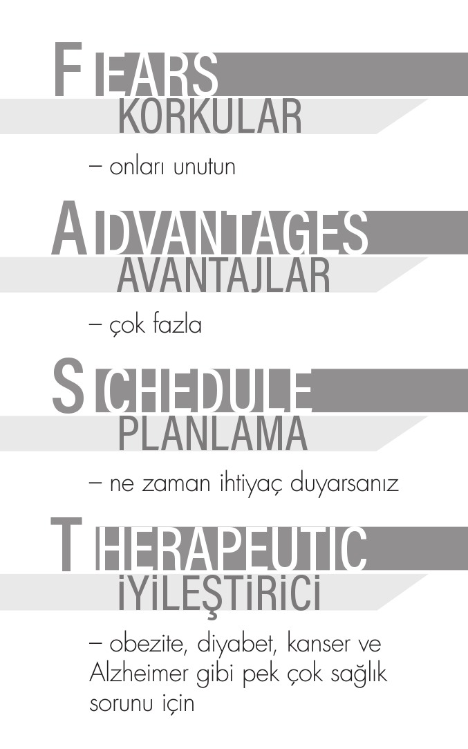 Bir süre yemek yememenin çok zor geleceğini tahmin edebiliyorum. Özellikle modern dünyamızda, her an her köşede yiyeceğe ulaşmak mümkün olduğundan bu gerçekten zor. Peki bu eğilimi kırmayı denemeye ve kısa bir süreliğine bile olsa yemek yemekten kaçınıp kendi gözlerinizle neler olduğuna bakmaya ne dersiniz? Neler olabileceğini düşünmeyi bir kenara bırakın, neler olduğuna bakmak için bu deneyime kucak açın. Bütün kilo ve sağlık sorunlarınızı çözecek demiyorum. Elbette ki her şeyi tedavi edemez. Ama oruç, sağlığınızın kontrolünü yeniden elinize almak için en güçlü yöntemlerden biri. Bu da hepimizin peşinde koşması gereken bir hedef olmalı!
