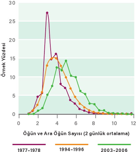 Şekil 1.1. Yetişkinlerin yediği ortalama günlük öğün ve ara öğün sayısı, 1977-1978’den 2003-2006’ya gelindiğinde 3’ten neredeyse 6’ya çıktı.