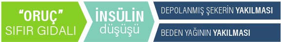 Yemek yediğimizde ortaya çıkan besin enerjisinin kullanılması ve depolanması süreci, oruç tuttuğumuz zaman tersine işler. İnsülin düzeyi düşerek bedene depolanmış enerjinin kullanılması sinyali gönderilir. Glikojen (karaciğerde depolanan glikoz), en kolay erişilebilir enerji kaynağıdır ve karaciğer bunu yaklaşık yirmi dört saat kadar yetecek miktarda depolar. Ardından beden, enerji üretmek için depoladığı yağı parçalamaya başlar.