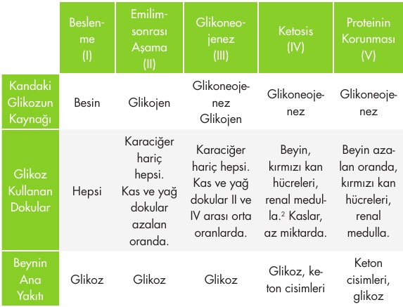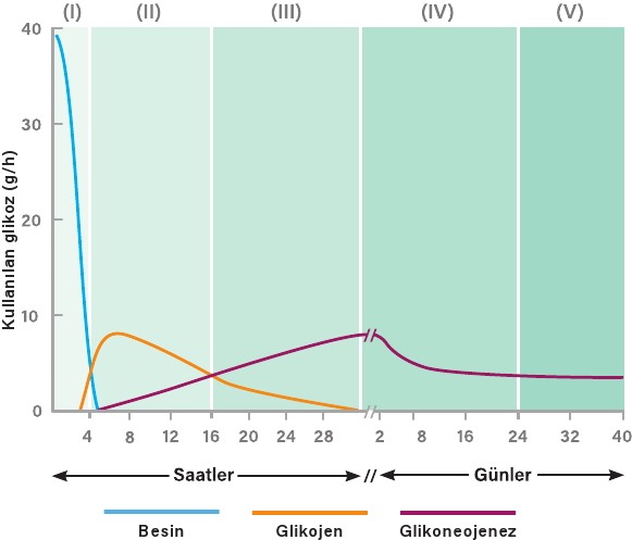 Şekil 1.2. Metabolizmanın beş aşaması. Oruç esnasında kan glikoz düzeyleri, depolanmış glikojenin parçalanması ve glikoneojenez yoluyla yeni glikozun üretilmesi sayesinde düzenlenir.