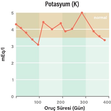 Potasyum, kalsiyum, magnezyum ve fosfor: Oruç esnasında potasyum düzeyleri çok az düşebilir ancak normal aralıklar içinde kalır. Magnezyum, kalsiyum ve fosfor düzeyleri de oruç sırasında sabit kalır. Kemikler bu mineralleri büyük miktarlarda depolar – tüm bedendeki miktarın yüzde 99’u buradadır. Normal olarak bazı mineraller dışkı ve idrarla atılır ama oruç sırasında bu kayıp minimum düzeydedir. Bununla birlikte çocuklarda ve hamilelerde bu minerallere yoğun bir gereksinim vardır, dolayısıyla oruç tutmaları önerilmez.