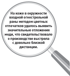 На коже в окружности входной огнестрельной раны методом цветных отпечатков удалось выявить значительные отложения меди, что свидетельствовало о производстве выстрела с довольно близкой дистанции.