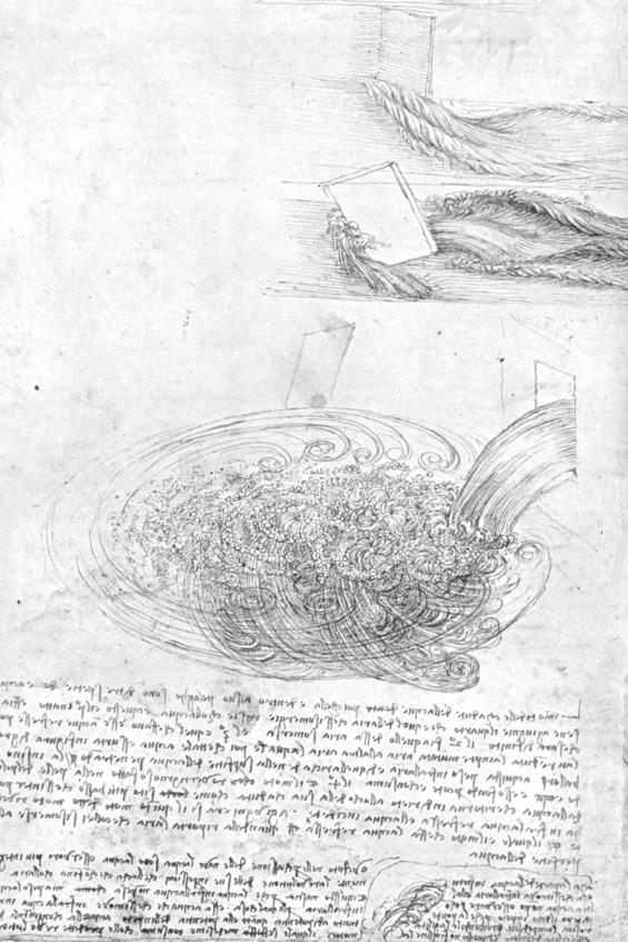 Вода – еще одна стихия, которая привлекала Леонардо. Всю жизнь он любовался ее движением. Невооруженным глазом он уловил и зарисовал завихрения воды, которые увидели современные ученые при помощи замедленной съемки. В конце жизни он заявил, что буйство воды покончит с миром, и сделал устрашающие рисунки потопа с пояснением: «Бушующие воды обрушиваются на содрогающийся от ужаса мир. Сумрачный воздух движим стремительным натиском ветров, прорезан нескончаемым дождем и градом. Вокруг огромные вывороченные деревья, превращаются в щепки неистовством ветра. Горы падают вниз на дно долин и образуют там барьер для воды. А вода все равно прорывается, вздымаясь громадными волами».