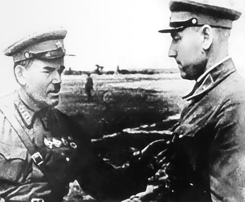 Командующий Харьковским военным округом И.К. Смирнов поздравляет командира 132-й стрелковой дивизии С.С. Бирюзова с успешно проведёнными учениями, 1940 г.