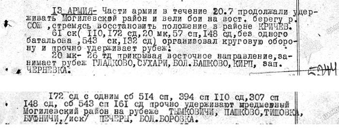 В сохранившейся оперативной сводке штаба 13-й армии за 14-е число сказано: «Армия продолжала упорные бои на Шкловско-Быховском направлении по уничтожению противника и восстановлению положения на восточном берегу реки Днепр… 61-й корпус продолжает бой…»