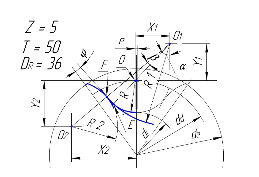 Смещение центров дуг впадин E = 1,5.