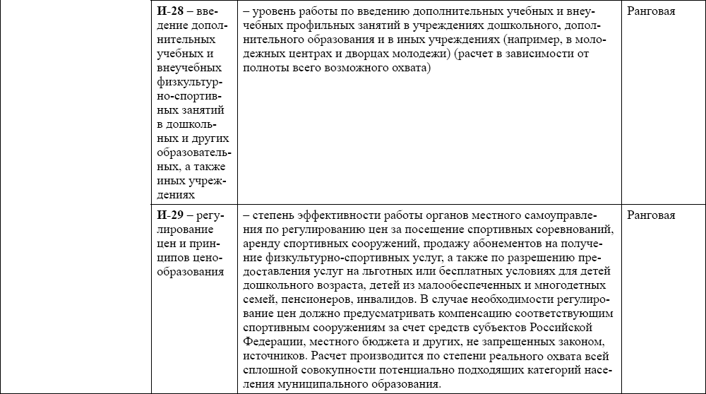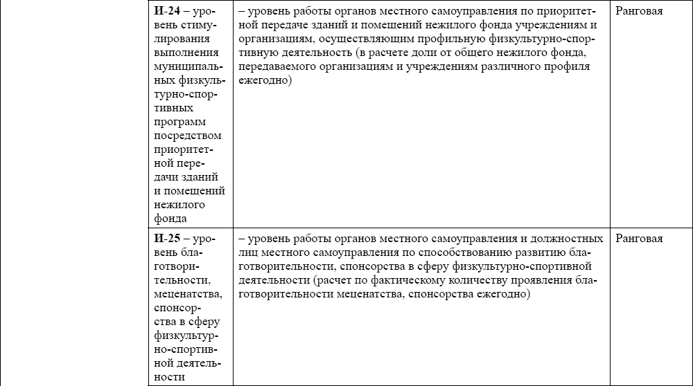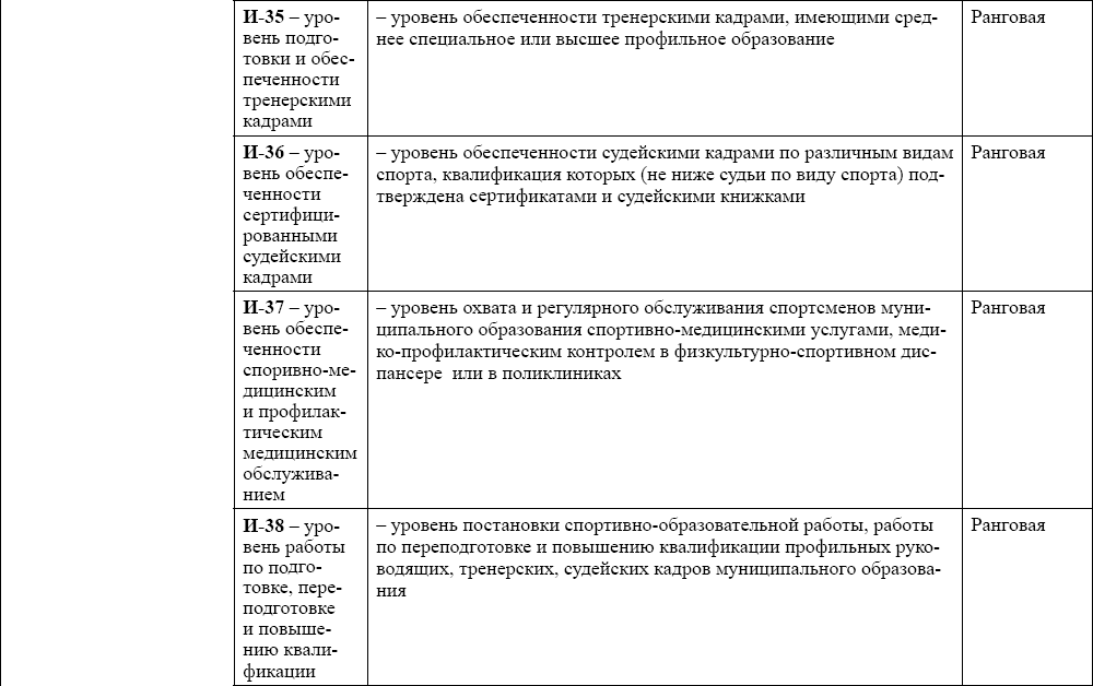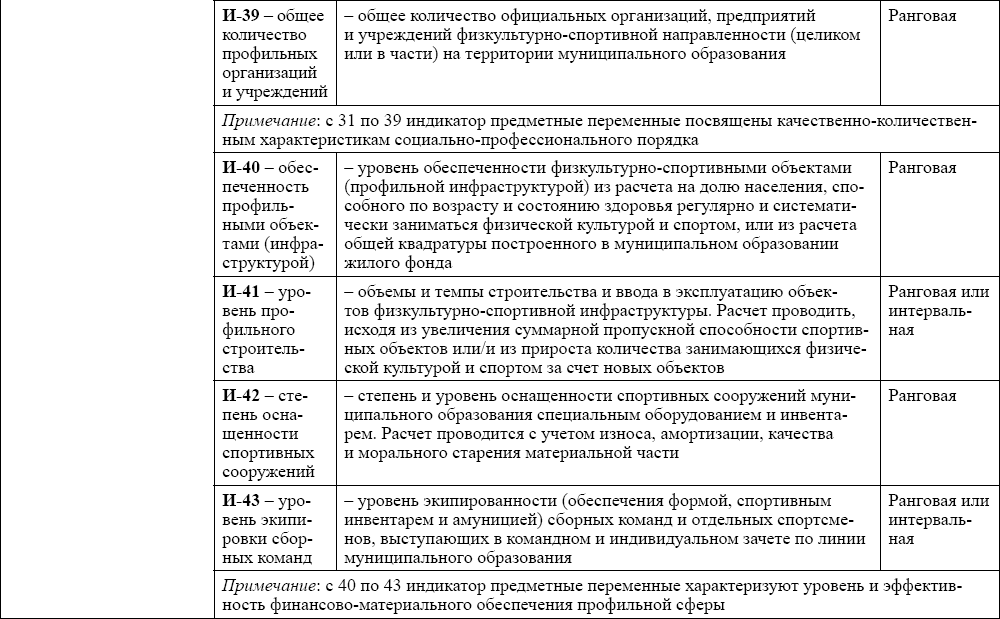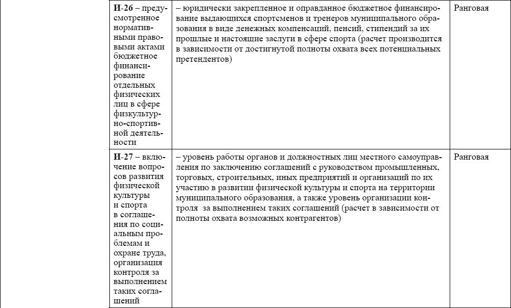 Конкретно было выделено три группы индикаторов (юридические, финансово-экономические, итогово-оценочные). Правда, группировка весьма условна, так как две первые группы пересекаются, а третья выступает практическим итогом, оценкой суммы первых двух. Однако данная группировка оправдана различной предметной соотнесенностью групп переменных-индикаторов: с правовой сферой, с областно законодательно допускаемого финансово-экономического протекционизма, с ежегодной практикой отчетов оценки суммарных показателей достижений физкультурно-спортивной сферы, принятой не только в муниципальном образовании, но и на региональном уровне управления спортом. Признаем, что отчетные индикаторы приняты нами с некоторой корректировкой, позволяющей избежать формально-статистических искажений.