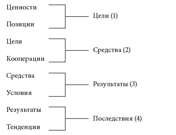 Во-вторых, функционально различную роль имеет каждый из двух элементов левого столбца схемы: первый как бы предзадан, уже очевиден либо из предшествующего опыта, либо непосредственно из предыдущих этапов разработки стратегии (с последним связан перенос правого элемента по схеме на ступень ниже в левую часть). Второй же элемент левого столбца выражает то, над чем в данный момент времени идет работа и поиск; в игровых ситуациях он всегда ситуативен (момент ситуативности сохраняется и при других формах использования схемы). Построение содержания правой части схемы – что является практической целью каждого этапа – складывается, таким образом, из связывания уже предзаданного и привносимого нового.