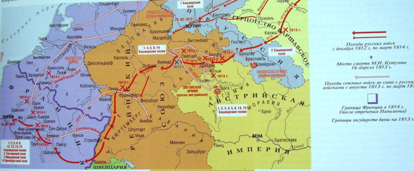 При освобождении Европы 1-й Башкирский полк принимал участие в сражениях под Берлином, Дрезденом, «Лисимбургом», под местечком Ютербок, под городами Винтербург, Десава, Бреда, в знаменитом сражении под Лейпцигом, под крепостью Дефентер, под городом «Лаон» и, наконец, под Парижем76.