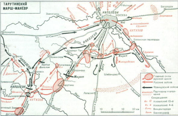 7 (по другим сведениям 9-го) сентября армия вышла на старую Калужскую дорогу у Красной Пахры. А затем пошла по Калужской дороге на юг и расположилась лагерем у с. Тарутино в 80 км юго-западнее Москвы8.