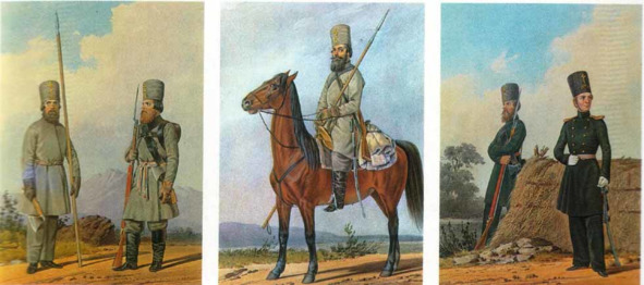 Пеший казаки и егерь, конный казак, воин и обер-офицер Московского ополчения. Раскраш. литографии по рис. Губарева. Сер. ХIХ в.